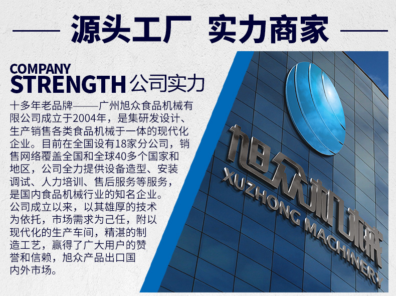 广州旭众食品机械有限公司是一家集科研开发,生产设计,营销服务为一体的现代化生产企业。现代化生产车间,精湛制造技术,所产机械历经市场重重考验,不断赢得海内外客户的赞誉。