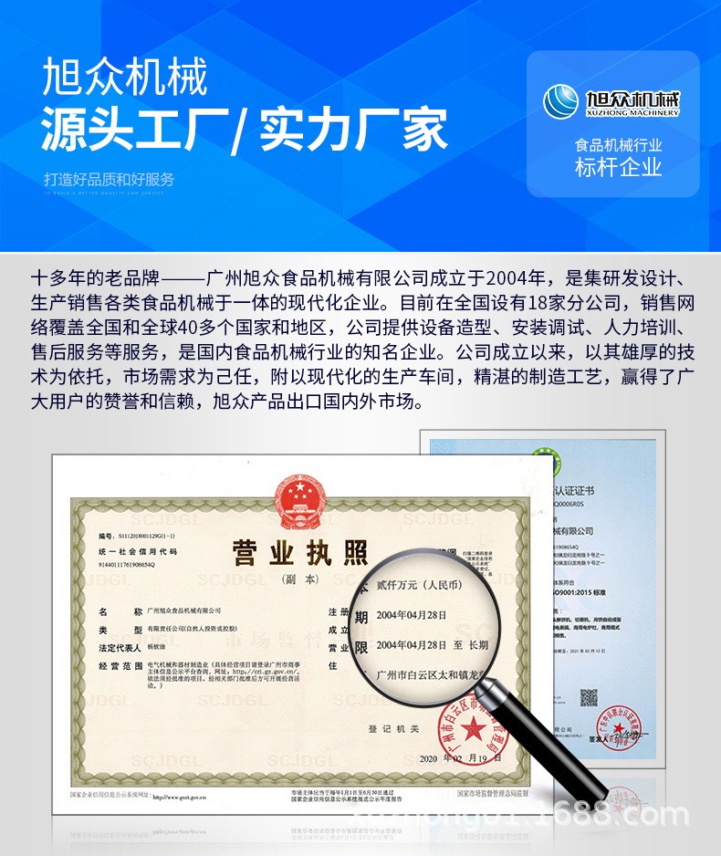 广州旭众食品机械有限公司是一家集科研开发,生产设计,营销服务为一体的现代化生产企业。现代化生产车间,精湛制造技术,所产机械历经市场重重考验,不断赢得海内外客户的赞誉。