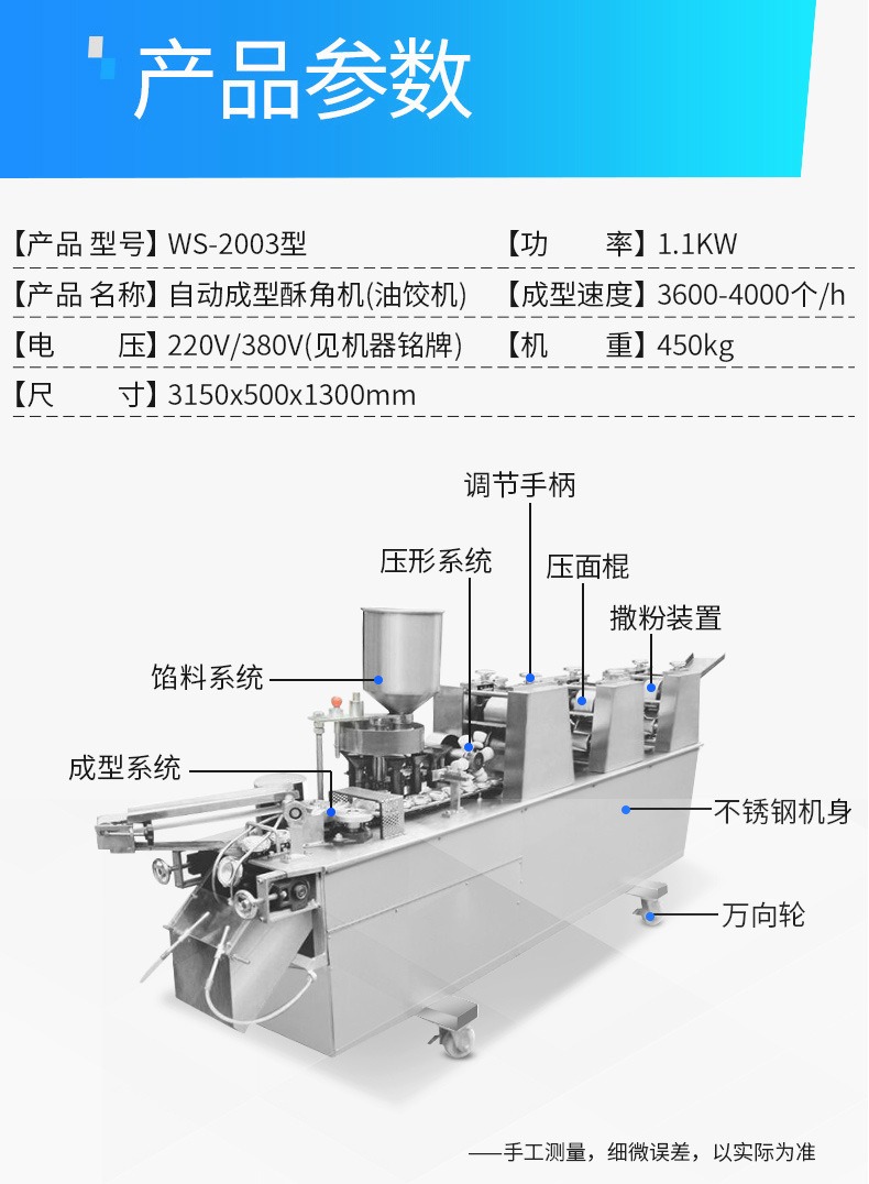 自动成型油饺机,创业商用、省时省力。适用于制作酥角、油饺。3000-4000每小时大产量。省力快速,做酥角、油饺的神器。自动撒粉 不粘机器。面粉均匀漏下,面皮不粘黏机器。